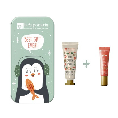 Lo scrigno contiene la combo che protegge mani e labbra dal rigido clima invernale e le tiene morbide, lisce e senza screpolature!