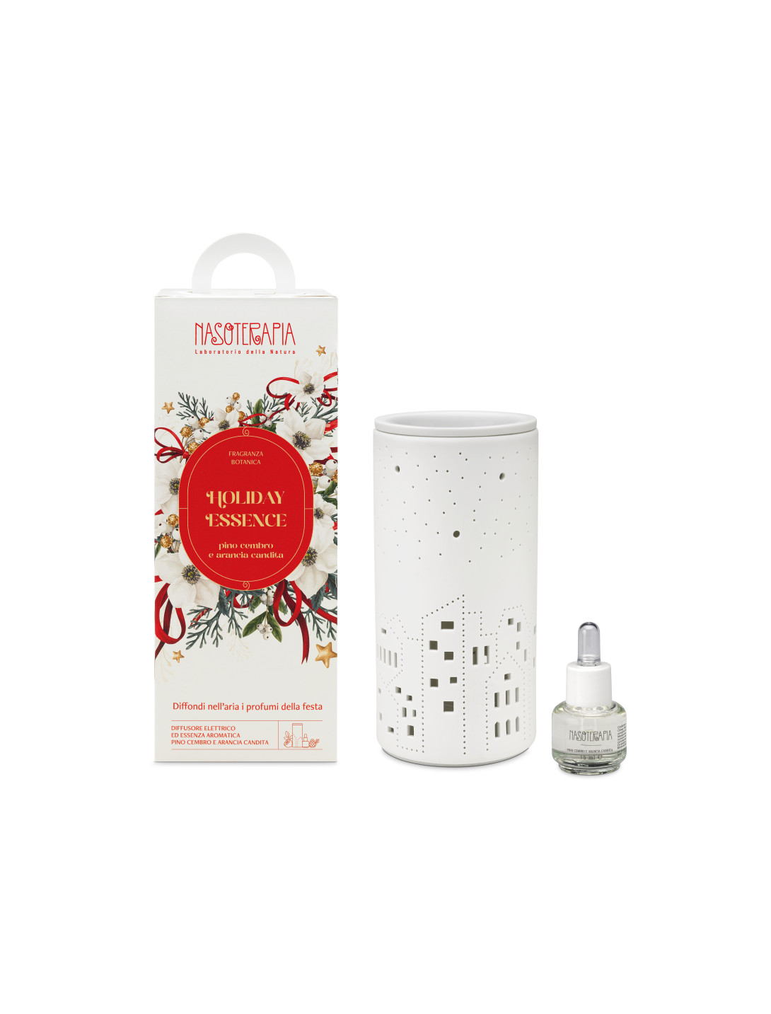 Un kit pensato per diffondere nell'aria l'atmosfera di Festa del Natale. Grazie al calore della lampada, il diffusore elettrico permette di diffondere in modo continuativo e silenzioso l'essenza aromatica Christmas Vibes, creando una bruma avvolgente dalle inconfondibili note di Arancia Candita e Pino Cembro.