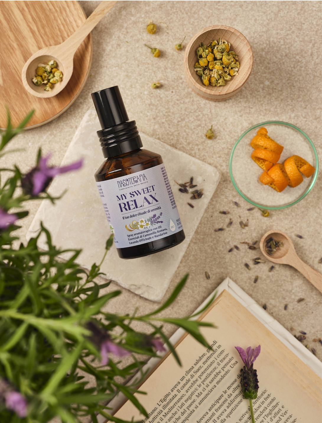 Spray rilassante per ambienti e tessuti.