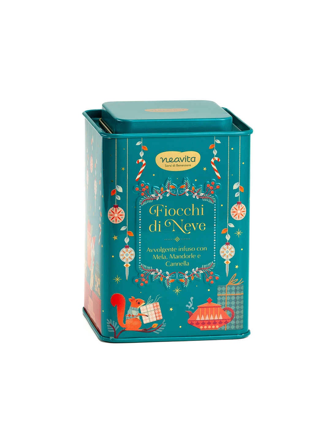 Confezione in latta a tema natalizio, richiudibile e riutilizzabile per altri infusi.